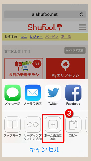 「ホーム画面に追加」を選択し、「ホームに追加」画面で「追加」を選択する。